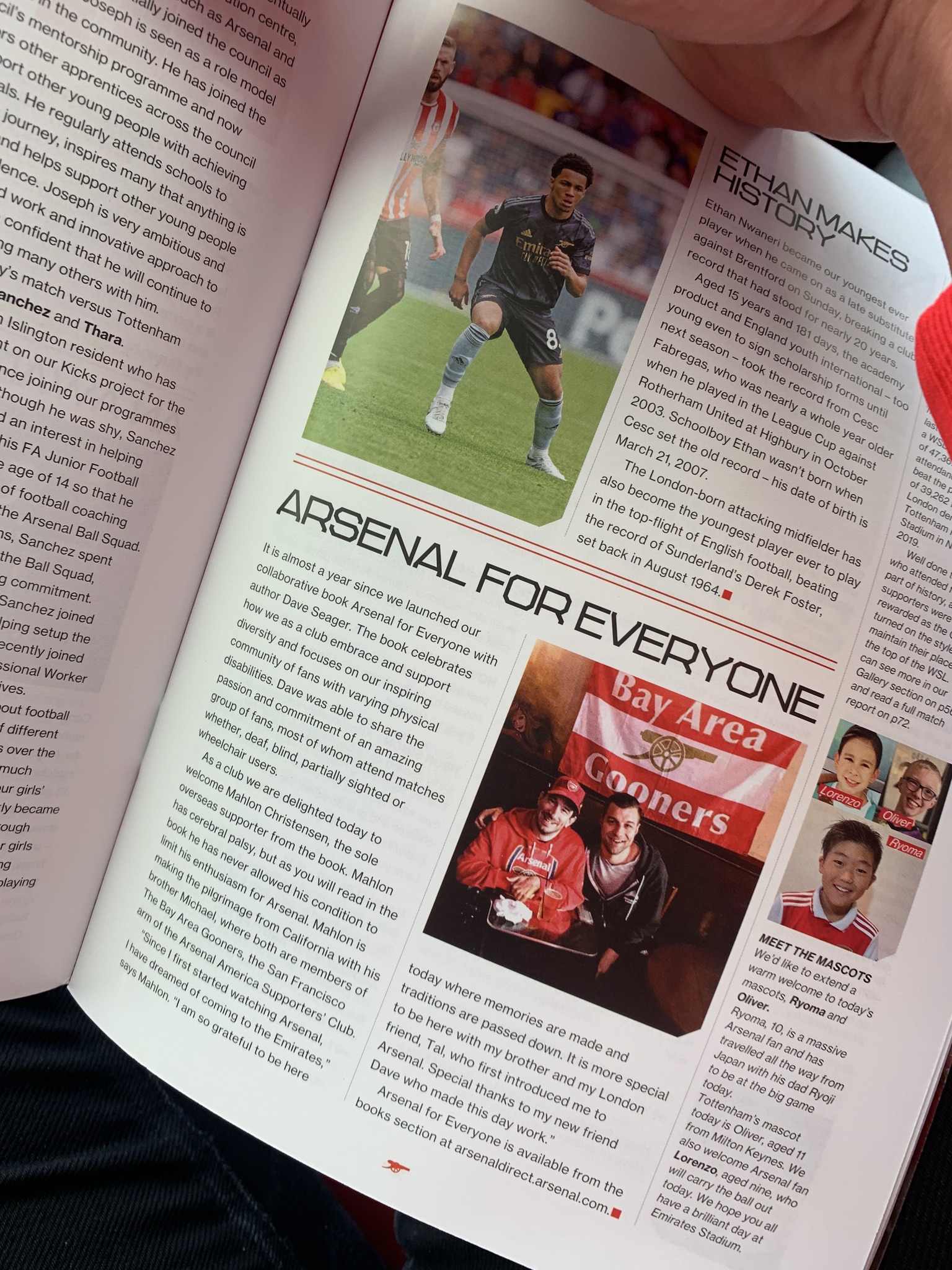 Finally seeing Arsenal at the Emirates was the fulfillment of a long time dream! I honestly thought that at my age and with the significant arrangements that are required for me to travel, that I might never see Arsenal play in person. Mahlon saw his dream day at the stadium further commemorated by inclusion in the matchday programme.