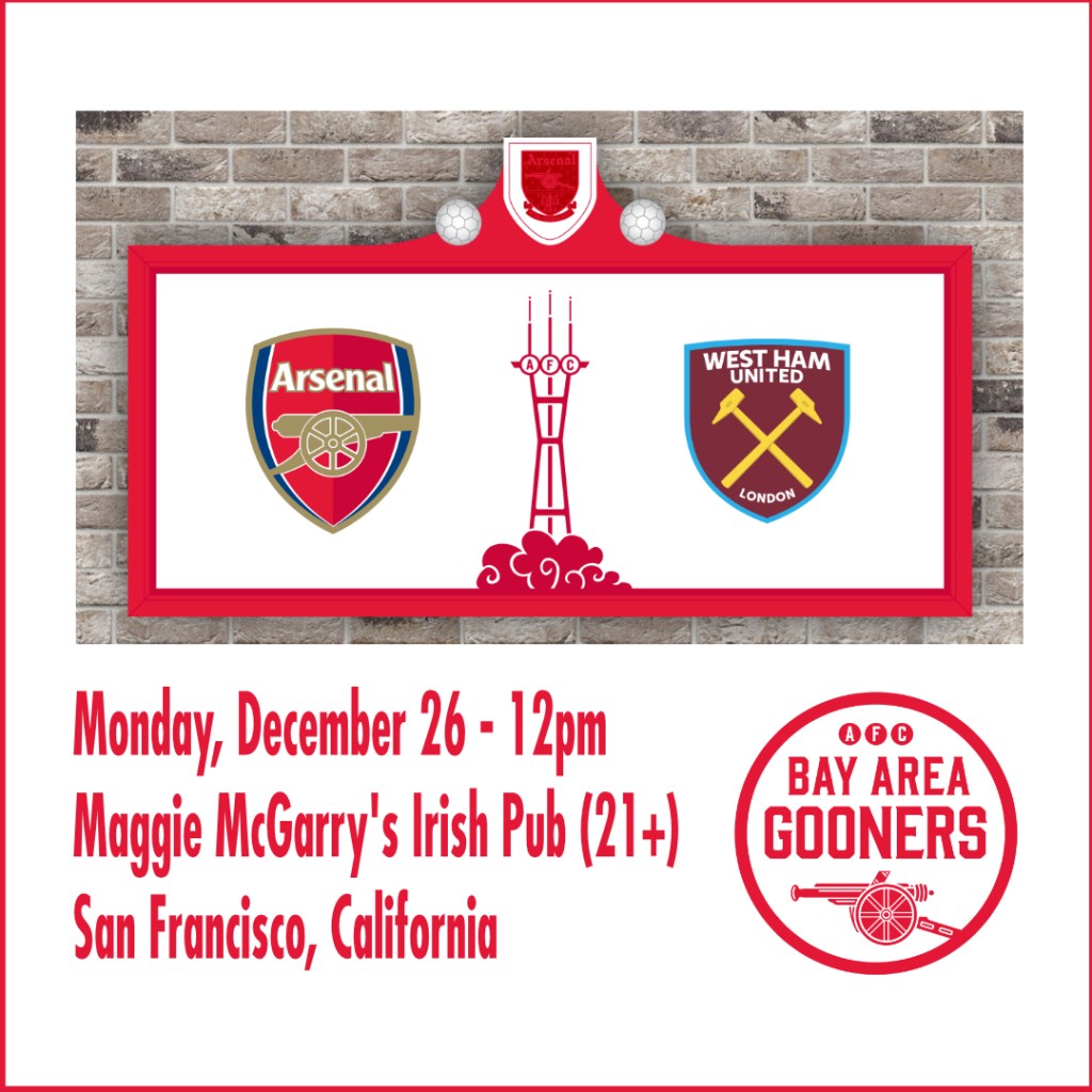The second half of the season kicks off with West Ham on Boxing Day. Kickoff is a lovely 12pm for West Coast Gooners and we’ll be back at Maggie McGarry’s for the match!