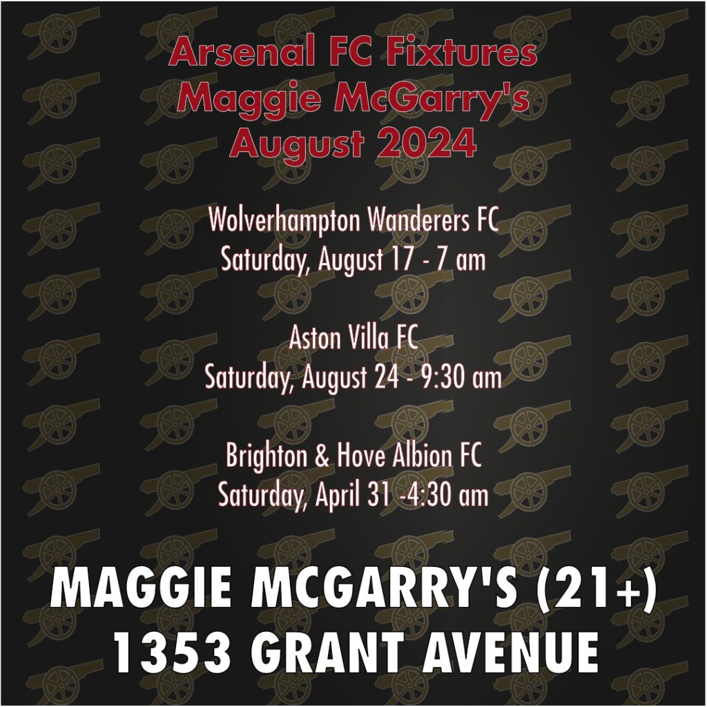 Arsenal’s 2024-2025 season kicks off against Wolves at home, for the first of three August matches. We’ll be at Maggie’s for the match, which has a very reasonable 7 am start time.