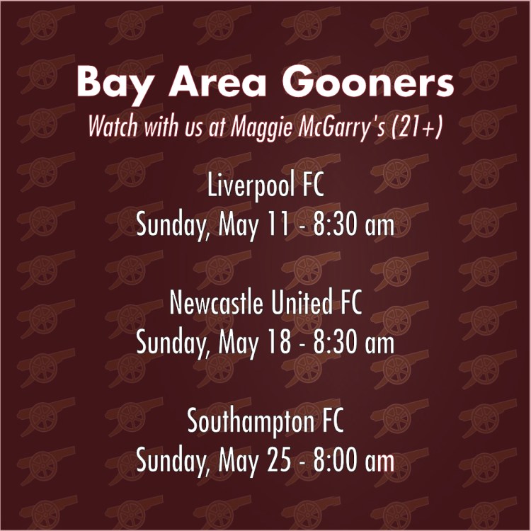 Still 3 matches left in the season, and as anti climatic as that is, we’ll be at Maggie’s for all of them. I’d love to see us beat the new champions on their home pitch this Sunday. We’re also hosting a Champions League Final match-viewing for the Arsenal Women on May 24th.