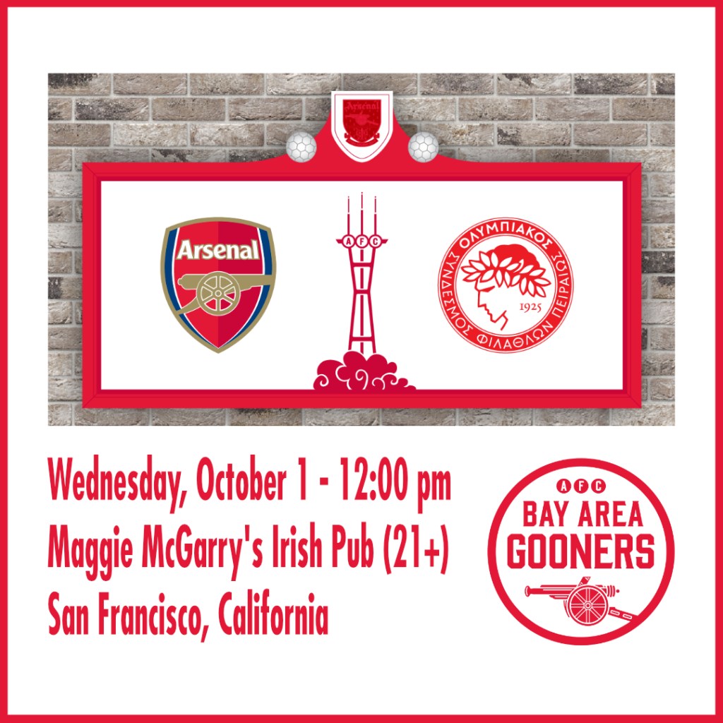 Arsenal’s Champions League league phase continues tomorrow as Olympiakos visit the Emirates. Kickoff time is 12:00 PM and Maggie’s will have the match on!