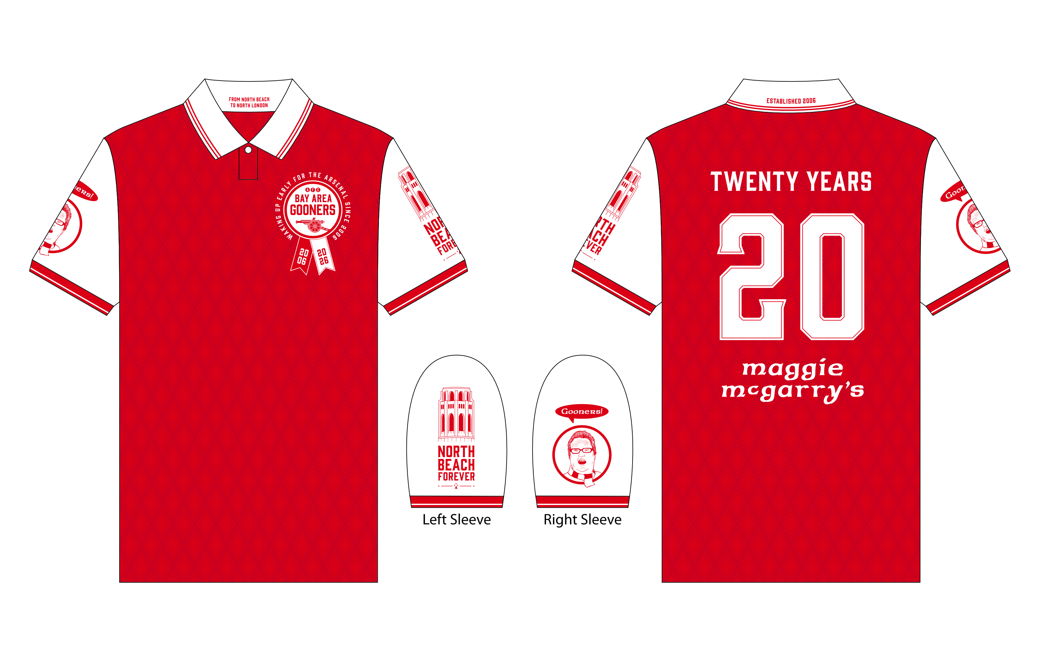 This is our 20th year as an Arsenal supporters group. We’ll be celebrating this milestone during the end of this season and the beginning of the next. To this end, we’re excited to announce a limited edition Bay Area Gooners 20th Anniversary Kit.