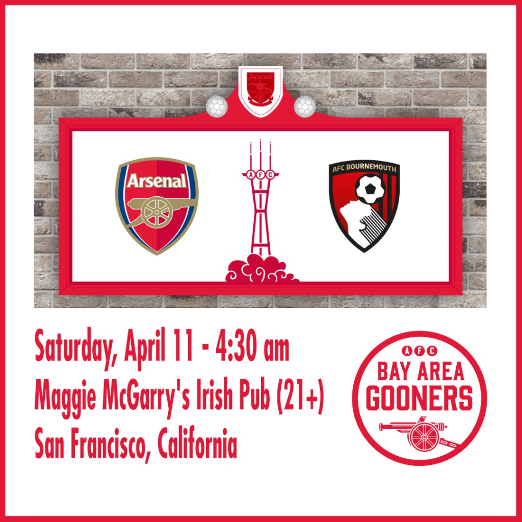 But it’s another must-win if Arsenal are to fend off City’s challenge and get their hands on the Premiership trophy. Time for the lads to take one more step towards becoming legends while Bay Area Gooners turning up at Maggie’s Saturday do the same.