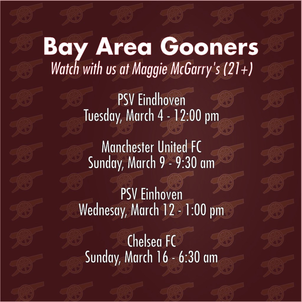 Attendance at Maggie’s has dipped a bit in recent weeks, but it’s a luxurious 9:30 am start Sunday, and I expect a good turnout. It’s also a perfect opportunity for you to pick up our new Bay Area Gooners t-shirt, while supplies last. Our amazing designer, Holly Hickman, knocked it out of the park again, with this one.